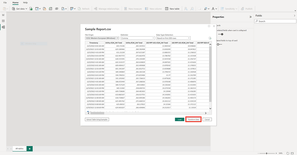 Power BI will automatically detect the imported data and recommend import options, once data type and datasource are selected. These suggestions are usually correct, but they can be changed if needed by selecting the File Origin and Delimiter options as needed. Select the "Transform Data" button at the bottom of the window to transform the imported data and open the Power Query Editor.