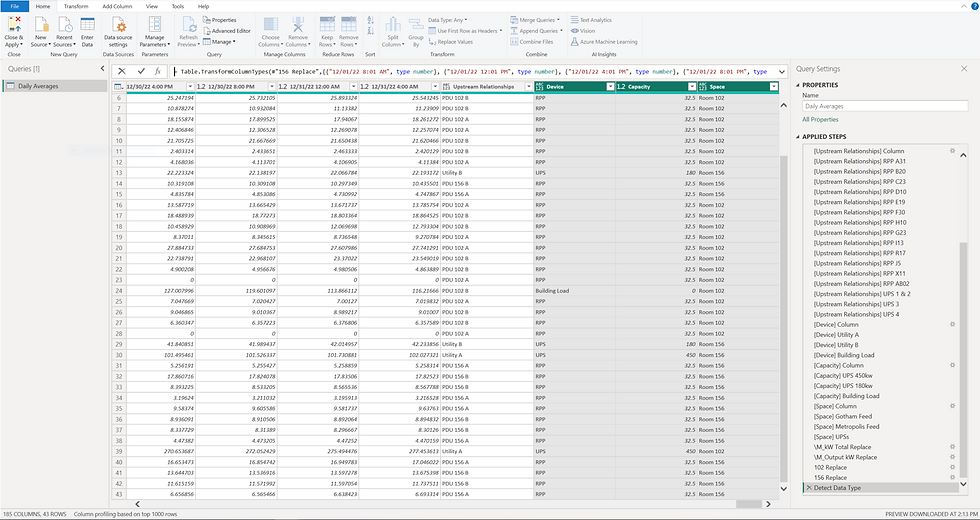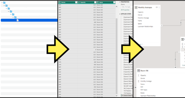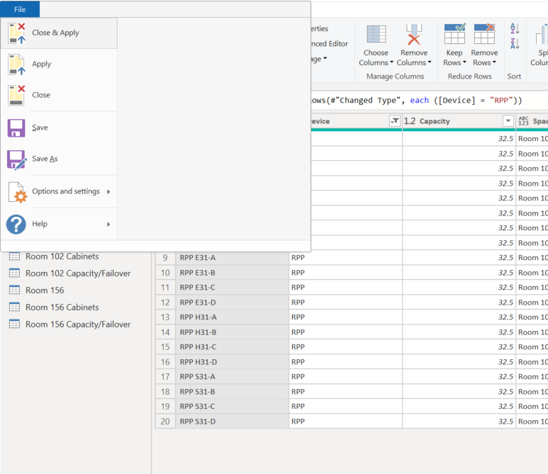 Devices and information can be synthesized at this stage by referencing the primary dataset(s) and then manipulating the table as needed. This is demonstrated in the ‘APPLIED STEPS’ portion of the 'PDUs' table in the image below: